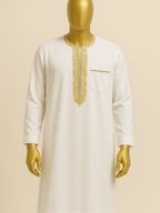 A deep emerald green kaftan accented with intricate golden embroidery along the neckline and chest pocket. Crafted with a mandarin collar and tailored fit, this piece exudes elegance and cultural pride, making it perfect for weddings, celebrations, and special events.