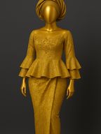 A stunning royal blue peplum blouse with intricate gold embroidery across the neckline and waist, paired with a coordinating wrapper for a regal, elegant look. The peplum cut accentuates the waist, while the rich color combination makes it a perfect choice for traditional celebrations and high-profile events.